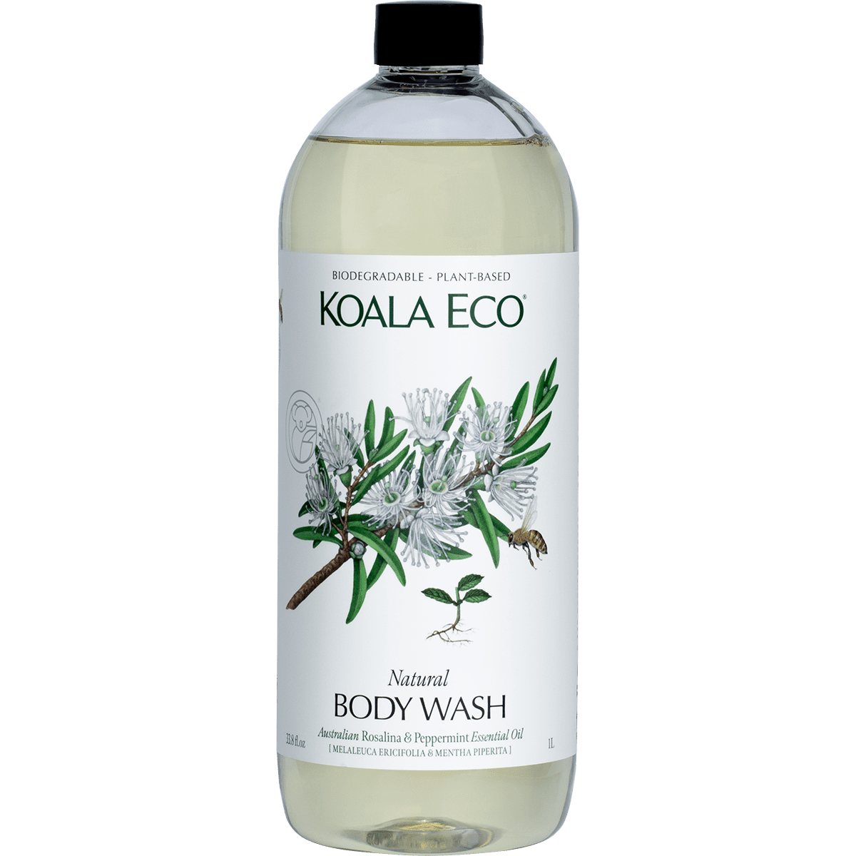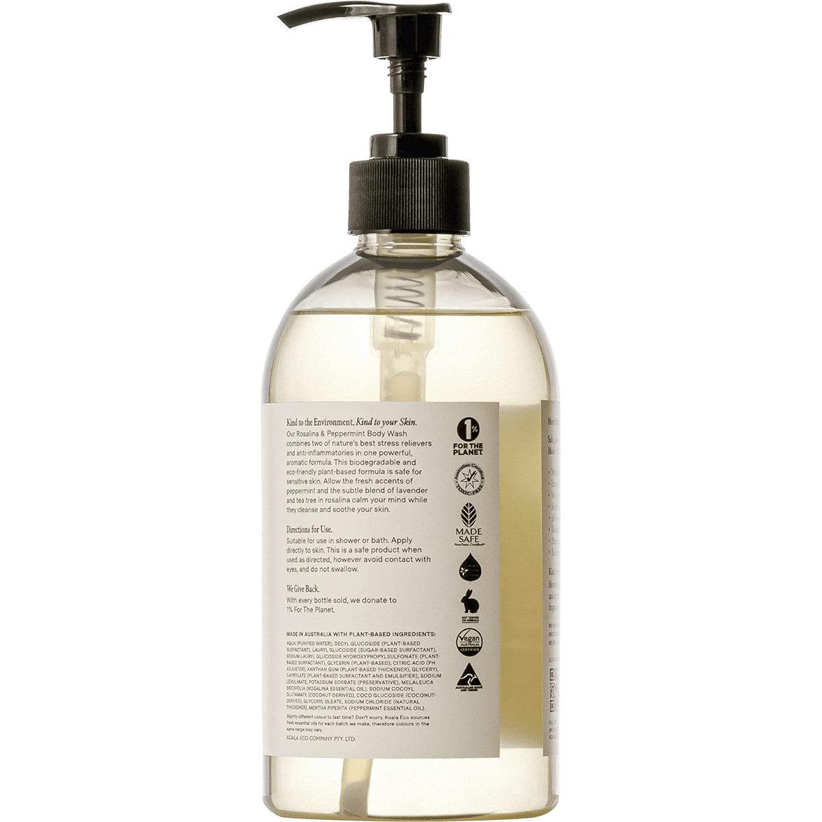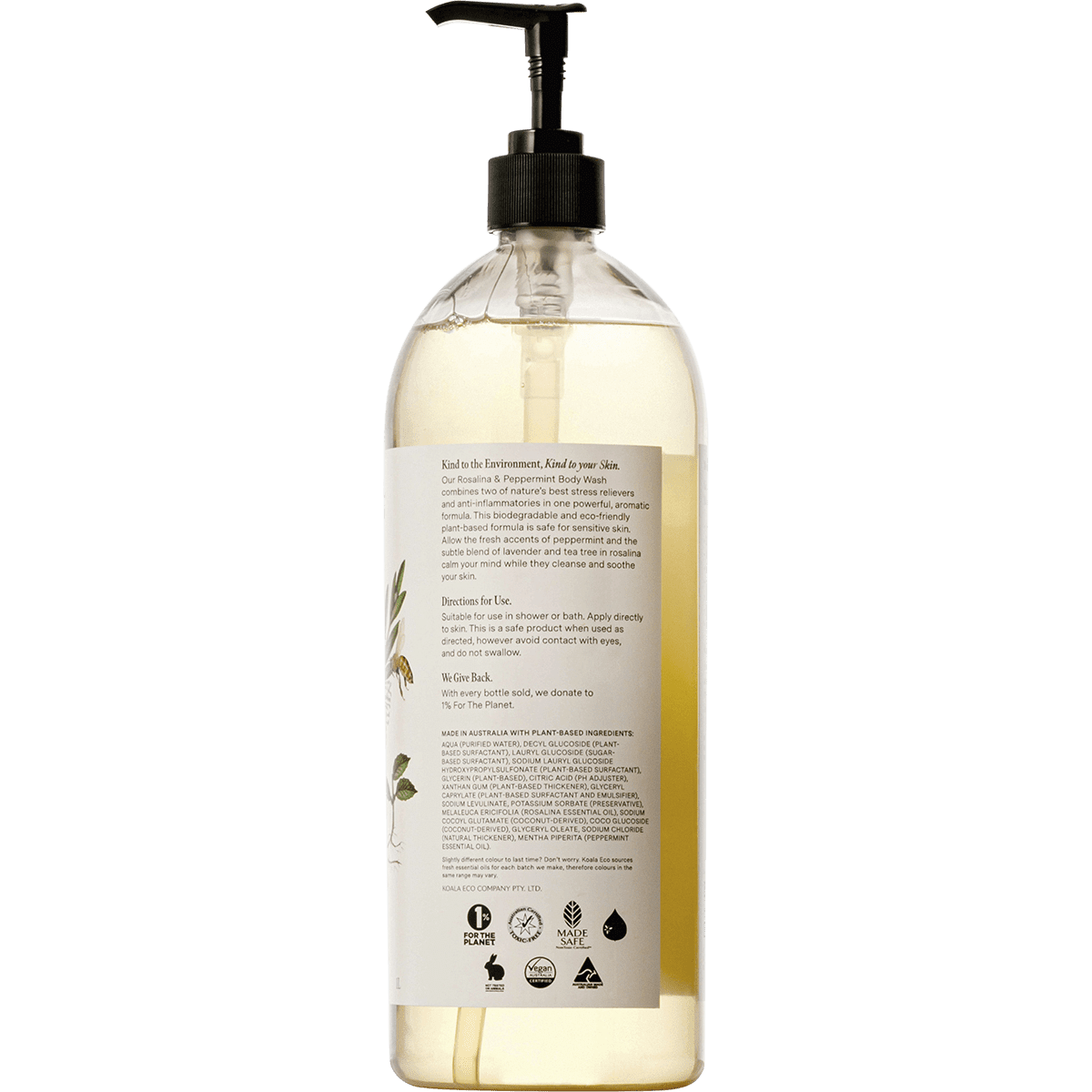Aqua (purified water), decyl glucoside (plant-based surfactant), lauryl glucoside (sugar-based surfactant), sodium lauryl glucoside hydroxypropylsulfonate (plant-based surfactant), glycerin (plant-based), citric acid (pH adjuster), xanthan gum (plant-based thickener), glyceryl caprylate (plant-based surfactant and emulsifier), sodium levulinate, potassium sorbate (preservative), melaleuca ericifolia (rosalina essential oil), sodium cocoyl glutamate (coconut-derived), coco glucoside (coconut-derived), glyceryl oleate, sodium chloride (natural thickener), mentha piperita (peppermint essential oil).
