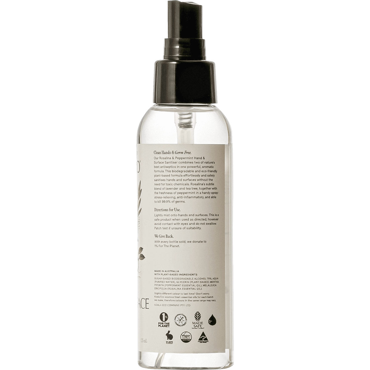 Sugar-based biodegradable alcohol 73%, aqua (purified water), glycerin (plant-based), mentha piperita (peppermint essential oil), melaleuca ericifolia (rosalina essential oil).