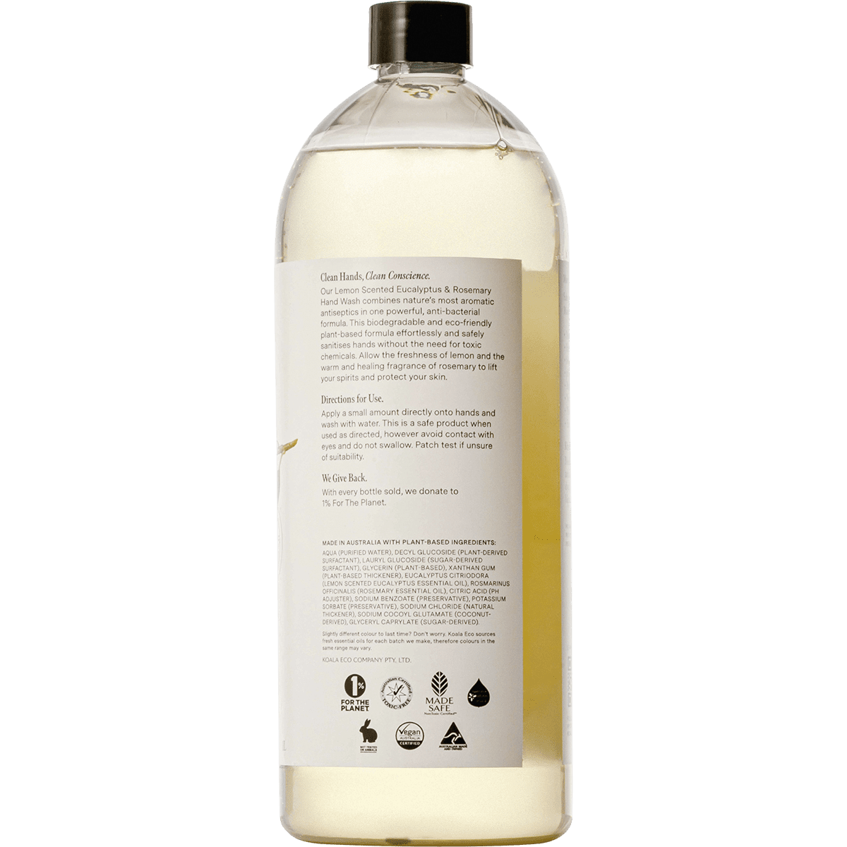 Aqua (purified water), decyl glucoside (plant-derived surfactant), lauryl glucoside (sugar-derived surfactant), glycerin (plant-based), xanthan gum (plant-based thickener), eucalyptus citriodora (lemon scented, eucalyptus essential oil), rosmarinus officinalis (rosemary essential oil), citric acid (pH adjuster), sodium benzoate (preservative), potassium sorbate (preservative), sodium chloride (natural thickener), sodium cocoyl glutamate (coconut-derived), glyceryl caprylate (sugar-derived).