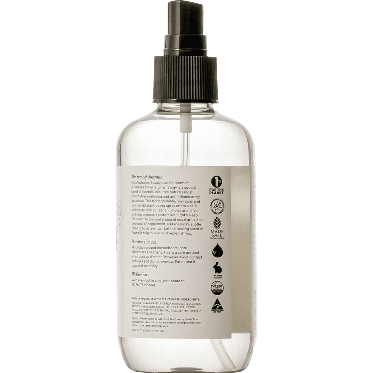 Natural Australian Eucalyptus, Peppermint & Rosalina Pillow and Linen Spray is a special blend of essential oils from nature’s most potent stress-relieving botanicals. This biodegradable, non-toxic and eco-friendly plant-based spray offers a safe and natural way to freshen pillows and linen and help promote a restorative night’s sleep.